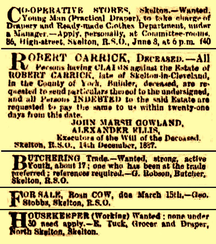 At the monthly meeting of the Skelton and Brotton Board a deputation consisting of John Gibson and Fred Winter [Skelton], George Mallett [Groundhill] and Thomas Herring and Charles Clark [Boosbeck] attended to discuss their recent application, the first in the country, under the Labourers' Allotment Act.