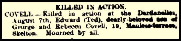 4898 Pte WILLIAM DYSON WALLIS, 10th (Prince of Wales's Own Hussars), aged 30. Born Howden, Yorks. Home at 41 Richard St, North Skelton. He is buried at Poperinghe Old Military Cemetery to the East of Ypres.