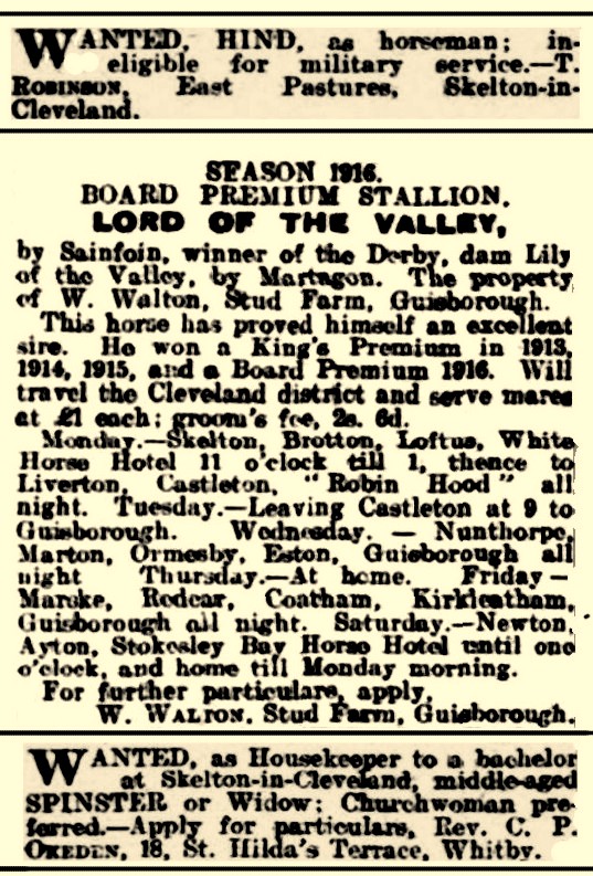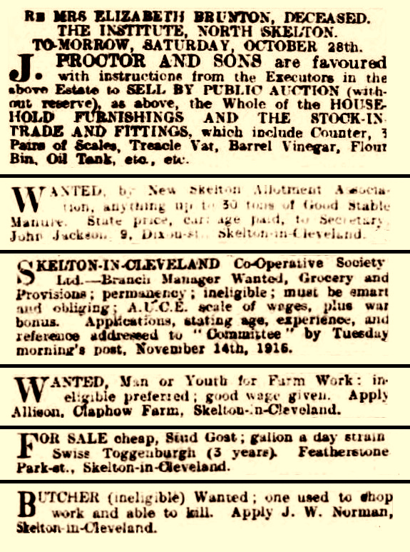 At the local tribunal, a 37 year old single man, Alfred Thomas Pattinson, who is employed in his father's Saddlery business at Skelton was given exemption until January 1st.