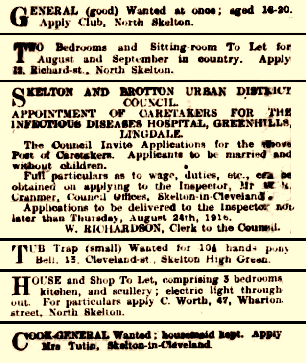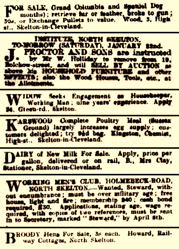 man capable of taking charge of the Department, which covered a wide area of Skelton, North and New Skelton, Boosbeck, Saltburn, Lingdale, Margrove Park, Charltons, Moorsholm etc and doing a trade of �800 per annum.