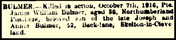 27828 Pte JAMES WILLIAM BULMER, 27th (Tyneside Irish) Bn, Northumberland Fusiliers, was killed in action, age 38.