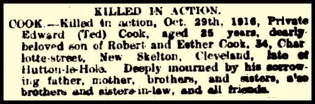 The son of Robert and Esther Cook of 34 Charlotte Street, New Skelton, N Yorks.