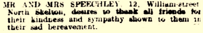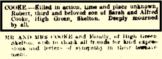 The son of Alfred and Sarah Cooke, 31 Cleveland St, Skelton Green, N Yorks.