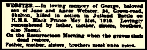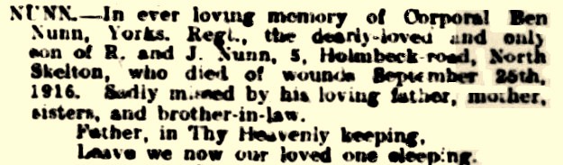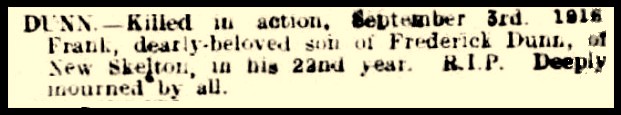 3326 GEORGE W BLUNDY, 4th Bn Yorkshire Regiment, was killed in action at hill 60, Ypres. He had been a worker at Skelton Castle.