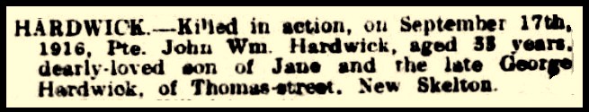 R/20547 Rifleman Thomas Robinson Glover. - Intimation has now been received that he was killed 15th September 1916.