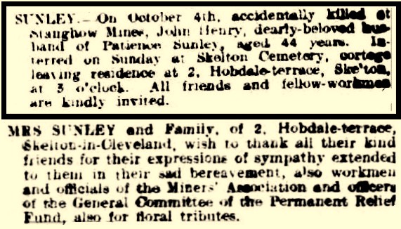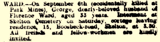 J Lee of Margrove Park had both his legs broken and R Smith of Boosbeck Rd, Skelton Green, sustained such a severe crushing of one of his legs that it had to be amputated at the Skelton Green Hospital, where both men were