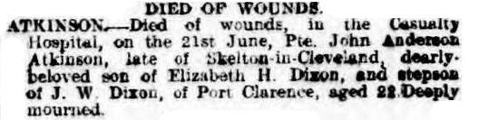 Died of wounds, aged 22, on the 21st June 1916.