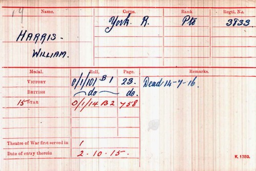 William's Medal Card shows that he was sent to France on the 2nd October 1915 and was awarded the 1914/15 Star.