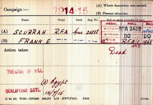 Frank's Medal Card shows that he was awarded the 1914/15 Star and first entered the War on the 14th July 1915 in Egypt.